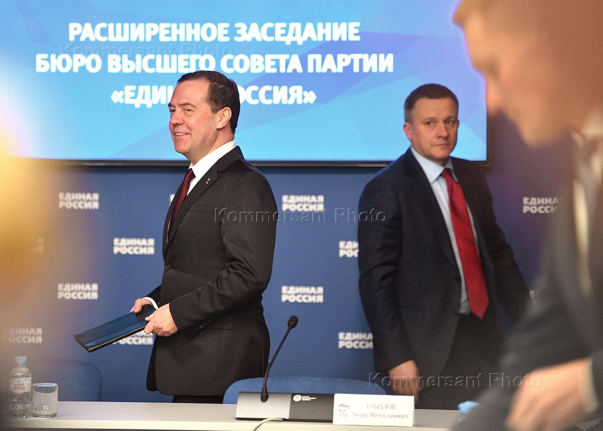 Расширенное заседание бюро высшего совета партии "Единая Россия". Заместитель председателя Совета Безопасности России, председатель партии "Единая Россия" Дмитрий Медведев (слева) во время заседания.