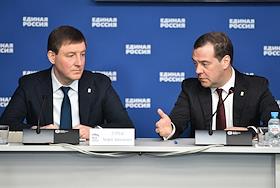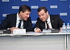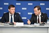 Расширенное заседание бюро высшего совета партии "Единая Россия". Заместитель председателя Совета Федерации России, секретарь Генерального совета партии "Единая Россия" Андрей Турчак (слева) и заместитель председателя Совета Безопасности России, председатель партии "Единая Россия" Дмитрий Медведев (справа) во время заседания.
