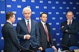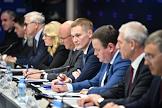 Расширенное заседание бюро высшего совета партии "Единая Россия". Первый заместитель председателя комитета Государственной думы России по физической культуре, спорту, туризму и делам молодежи Вячеслав Фетисов (в центре), ректор Московского государственного университета Виктор Садовничий (второй справа) и мэр Москвы Сергей Собянин (второй слева) перед началом заседания.
