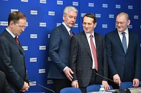 Расширенное заседание бюро высшего совета партии "Единая Россия". Слева направо: помощник президента России Владимир Мединский, мэр Москвы Сергей Собянин и директор Службы внешней разведки Сергей Нарышкин перед началом заседания.