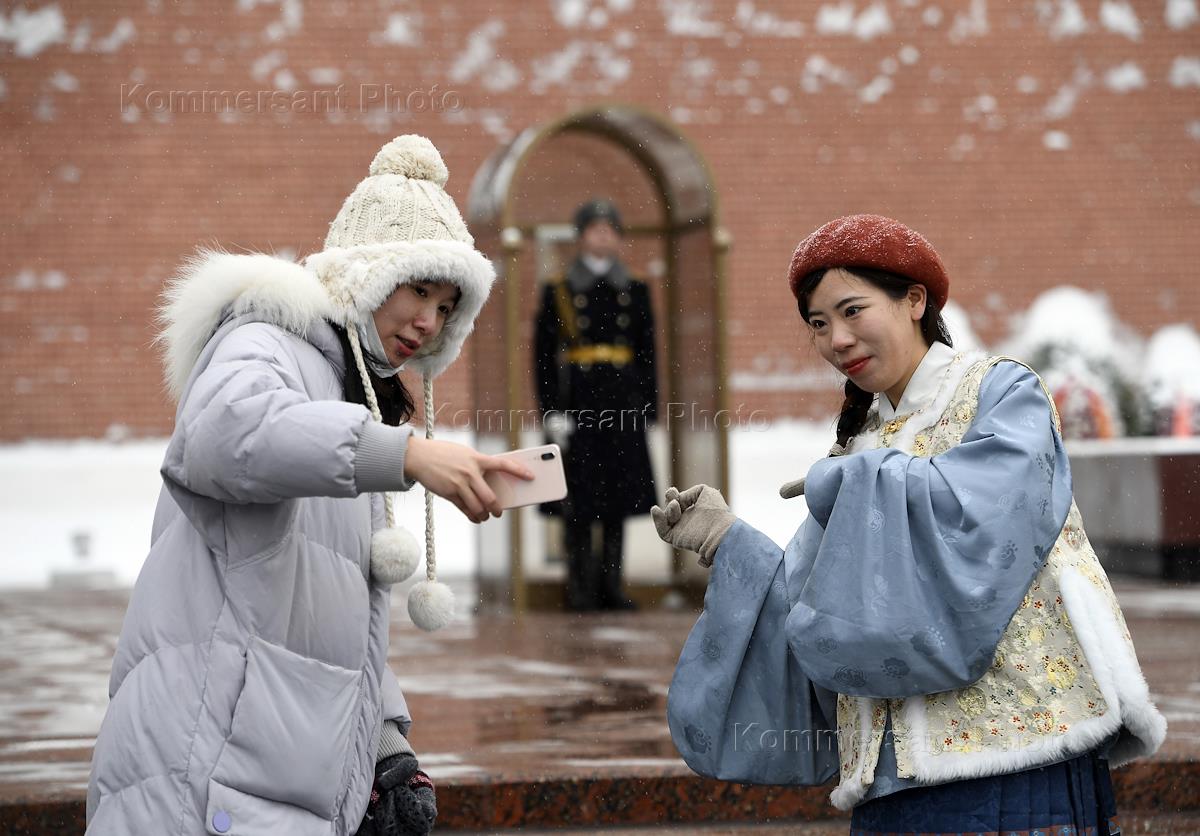 Иностранные туристы из Азии фотографируются у Вечного огня у мемориала "Могила Неизвестного солдата" в Александровском саду.