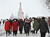 Иностранные туристы из Азии на Красной площади фотографируются на мобильный телефон.