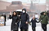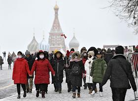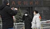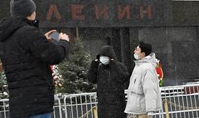 Иностранные туристы из Азии на Красной площади фотографируются у Мавзолея вождя революции Владимира Ленина.