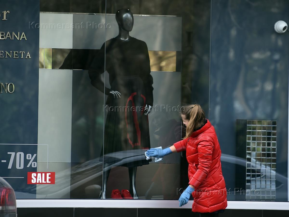 Жанровая фотография. Сотрудница магазина моет витрину.