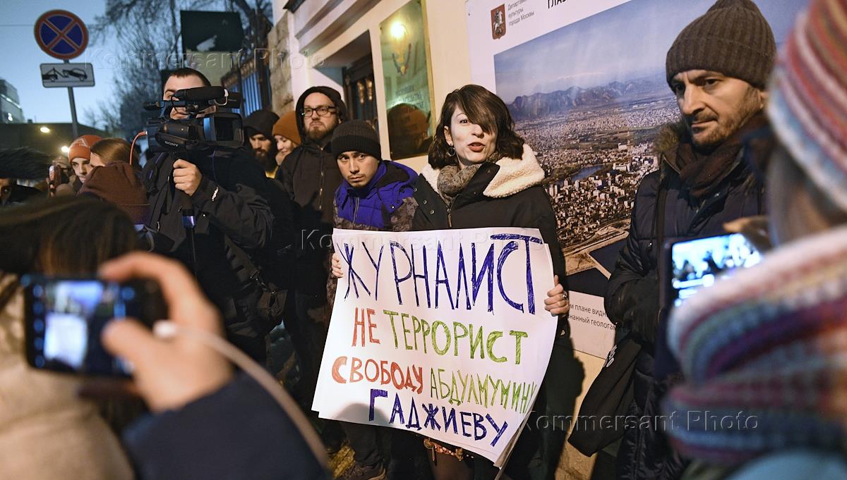 Участник одиночного пикета, журналист Илья Азар в поддержку журналиста дагестанской газеты "Черновик" Абдулмумина Гаджиева у постоянного Представительства Республики Дагестан в Москве.