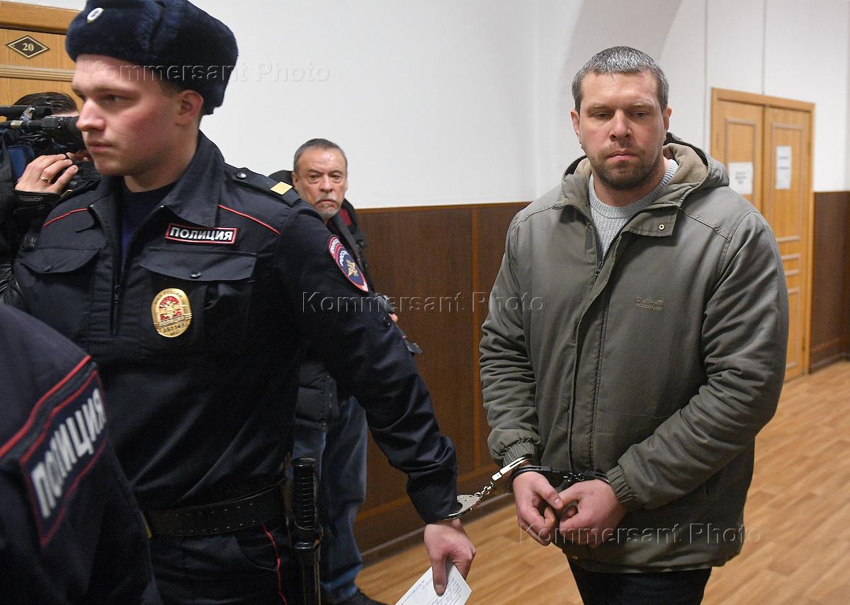Former police officer of the Internal Affairs Directorate for the Moscow Western Administrative District Denis Konovalov (right) arrives at the hearing in Basmanny District Court.