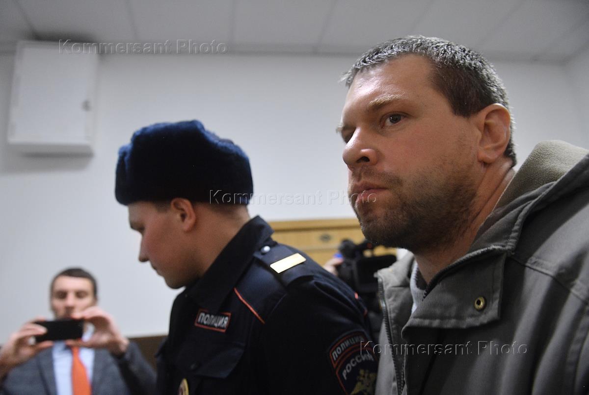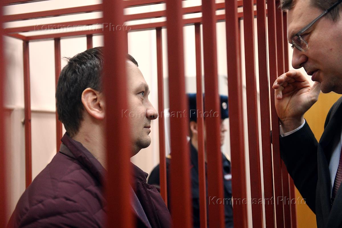 Бывший сотрудник УВД по Западному административному округу ГУ МВД России по Москве Денис Коновалов (справа) перед началом заседания Басманного районного суда.