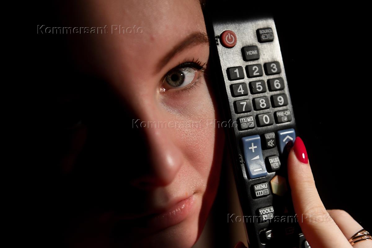 Жанровая фотография. Цифровое телевидение. Онлайн-кинотеатры. Девушка с телевизионным пультом.