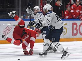 Континентальная хоккейная лига (КХЛ). Чемпионат сезона 2019/20. Матч между командами "Спартак" (Москва) и "Динамо" (Москва) на стадионе "ЦСКА Арена". Игрок команды "Спартак" Максим Цыплаков (в центре) и игрок команды "Динамо" Михал Чайковски (справа) во время матча.