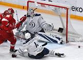 Континентальная хоккейная лига (КХЛ). Чемпионат сезона 2019/20. Матч между командами "Спартак" (Москва) и "Динамо" (Москва) на стадионе "ЦСКА Арена". Вратарь команды "Динамо" Иван Бочаров (справа) во время матча.