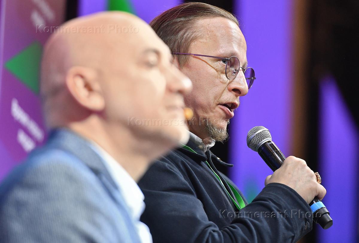 Учредительный съезд политической партии "За правду" в "Телеграфф-холле". Художественный руководитель Московского художественного академического театра (МХАТ) имени М. Горького Эдуард Бояков (справа) на съезде.