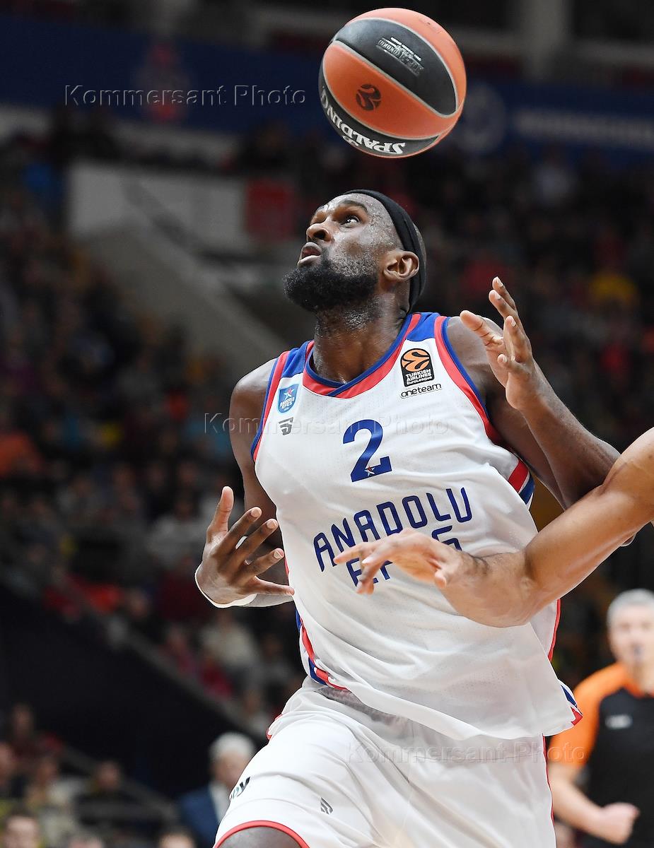 Евролига по баскетболу. Матч между командами ЦСКА (Москва, Россия) - "Анадолу Эфес" (Стамбул, Турция) на арене "Мегаспорт". Игрок команды "Анадолу Эфес" Крис Синглтон (в центре) во время матча.