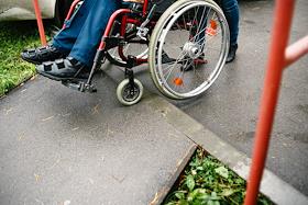 Жанровая фотография. Человек на коляске застрял во время переезда бордюра.