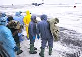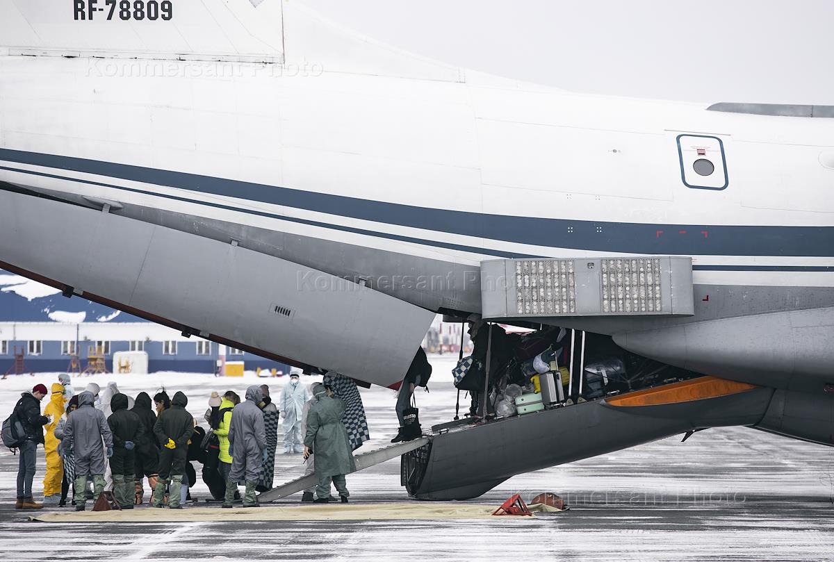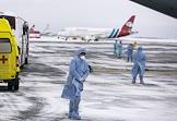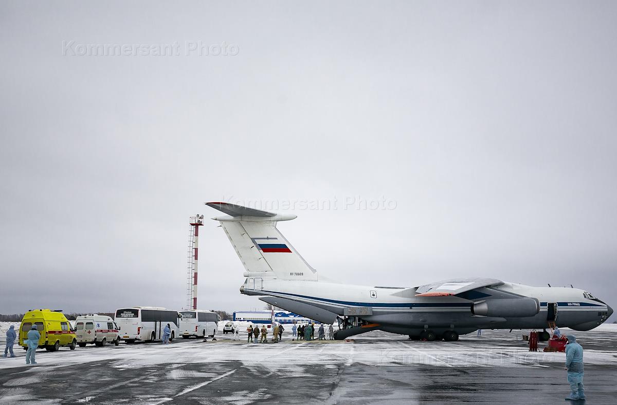 Эвакуация россиян из Китая в связи с распространением коронавирусной инфекции. Сотрудники международного аэропорта Тюмень (Рощино) имени Д.И. Менделеева во время встречи пассажиров. Защитная одежда, спецодежда для дезинфекции, бахилы, летное поле