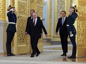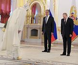 Церемония вручения верительных грамот вновь прибывших послов иностранных государств в Александровском зале Большого Кремлевского дворца. Министр иностранных дел России Сергей Лавров (справа) и президент России Владимир Путин (в центре) во время церемонии.