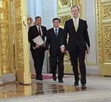 Церемония вручения верительных грамот вновь прибывших послов иностранных государств в Александровском зале Большого Кремлевского дворца. Слева направо: чрезвычайный и полномочный посол Монголии в России Дуламсурэн Даваа, чрезвычайный и полномочный посол Китайской народной республики (КНР) Чжан Ханьхуэй и чрезвычайный и полномочный посол Австралии в России Грейм Лесли Михан во время церемонии.