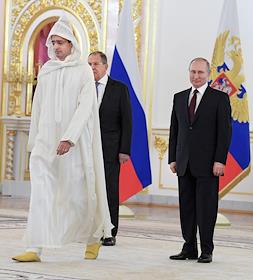 Церемония вручения верительных грамот вновь прибывших послов иностранных государств в Александровском зале Большого Кремлевского дворца. Слева направо: чрезвычайный и полномочный посол Марокко в России Лотфи Бушаара, министр иностранных дел России Сергей Лавров и президент России Владимир Путин во время церемонии.