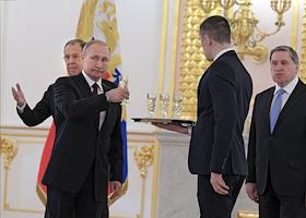 Церемония вручения верительных грамот вновь прибывших послов иностранных государств в Александровском зале Большого Кремлевского дворца. Министр иностранных дел России Сергей Лавров (второй слева) и президент России Владимир Путин (второй справа) во время церемонии.