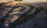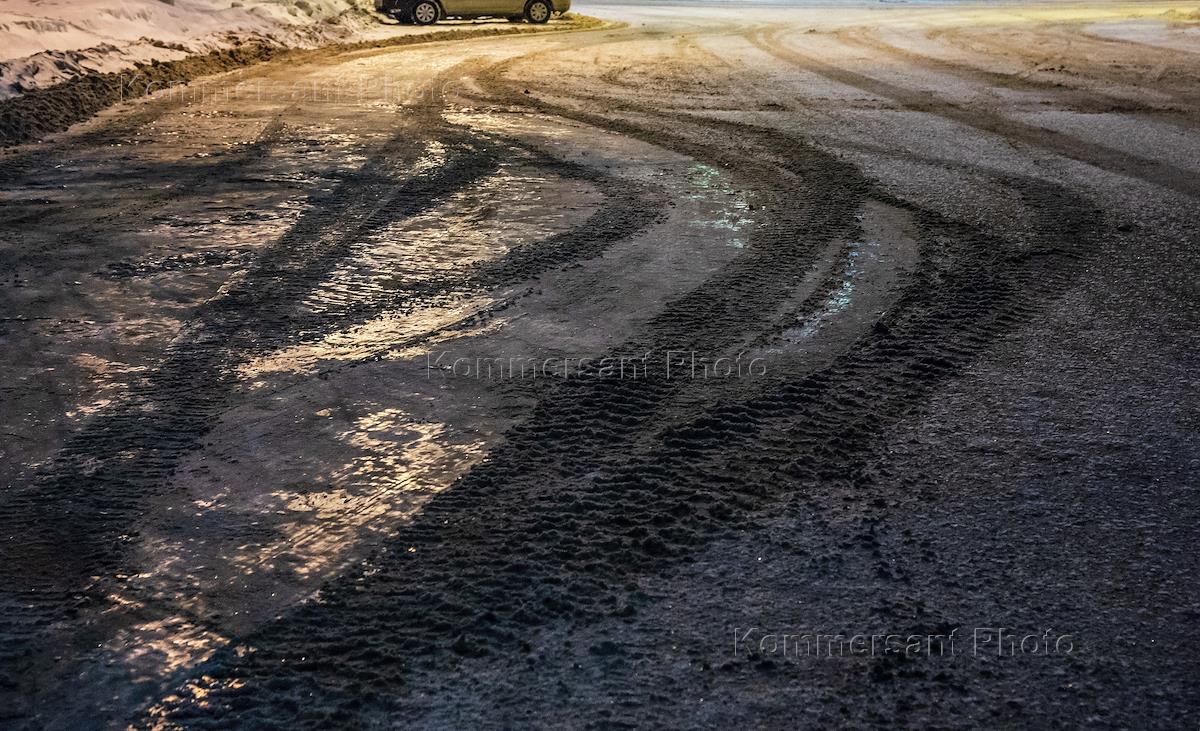 Жанровая фотография. Следы протекторов шин автомобиля на снегу.