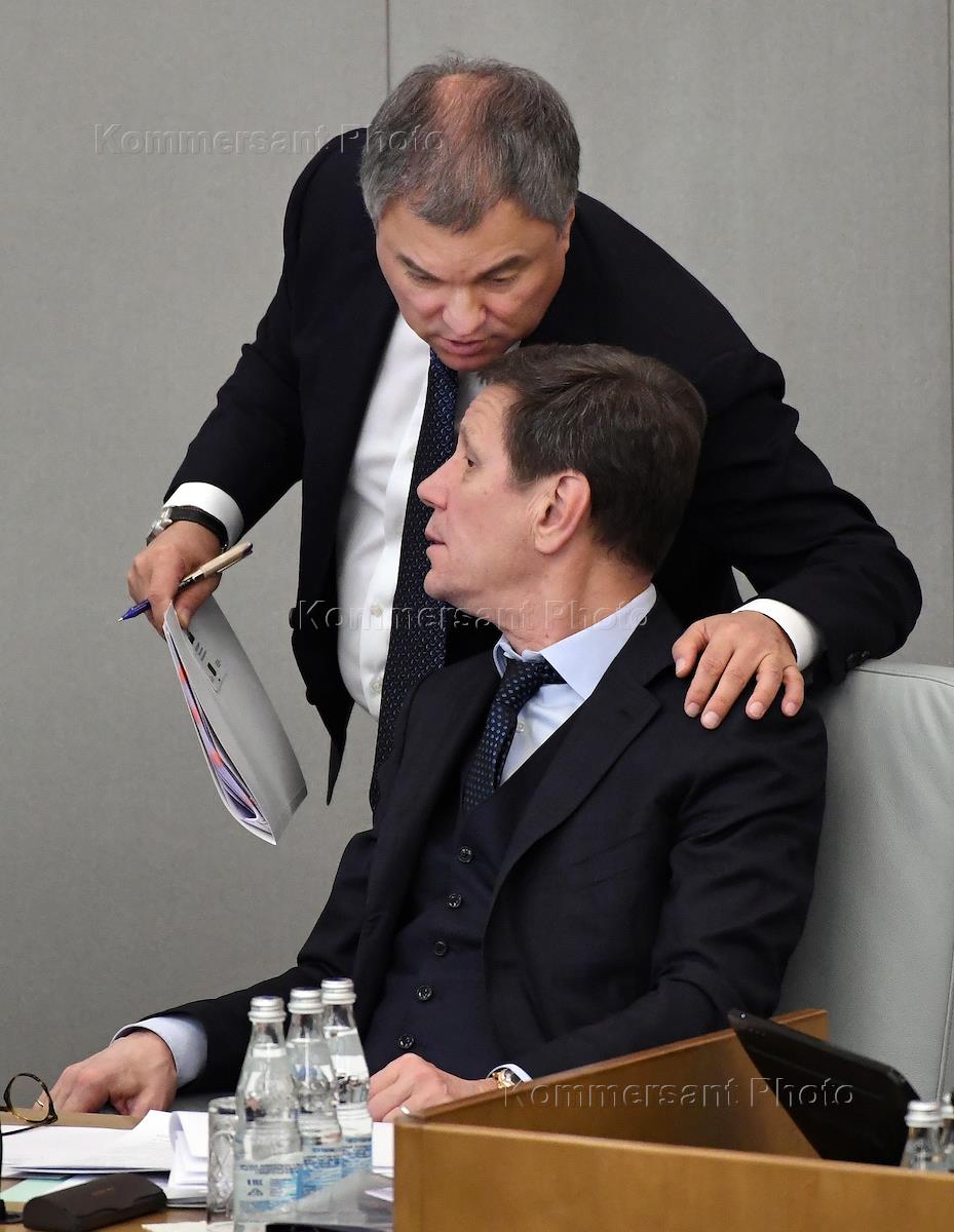 Пленарное заседание Государственной думы (ГД) России. Председатель ГД России Вячеслав Володин (слева) и его первый заместитель Александр Жуков (справа) во время заседания.