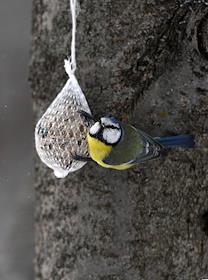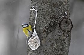 Жанровая фотография. Снегопад в Москве. Кормушка на дереве для птиц. Синица клюет зерно.