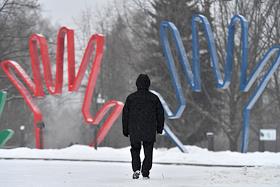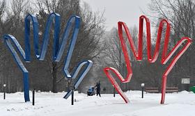 Жанровая фотография. Снегопад в Москве. Инсталляция "Руки" в парке.