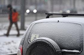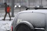 Жанровая фотография. Снегопад в Москве. Заснеженный автомобиль со знаком "Инвалид" на парковке в центре города.