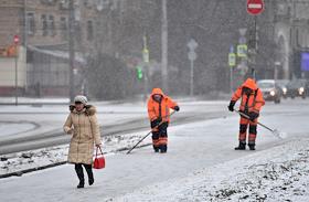 Виды Москвы во время снегопада. Жанровые фотографии. Дворники чистят улицу от снега.
