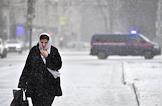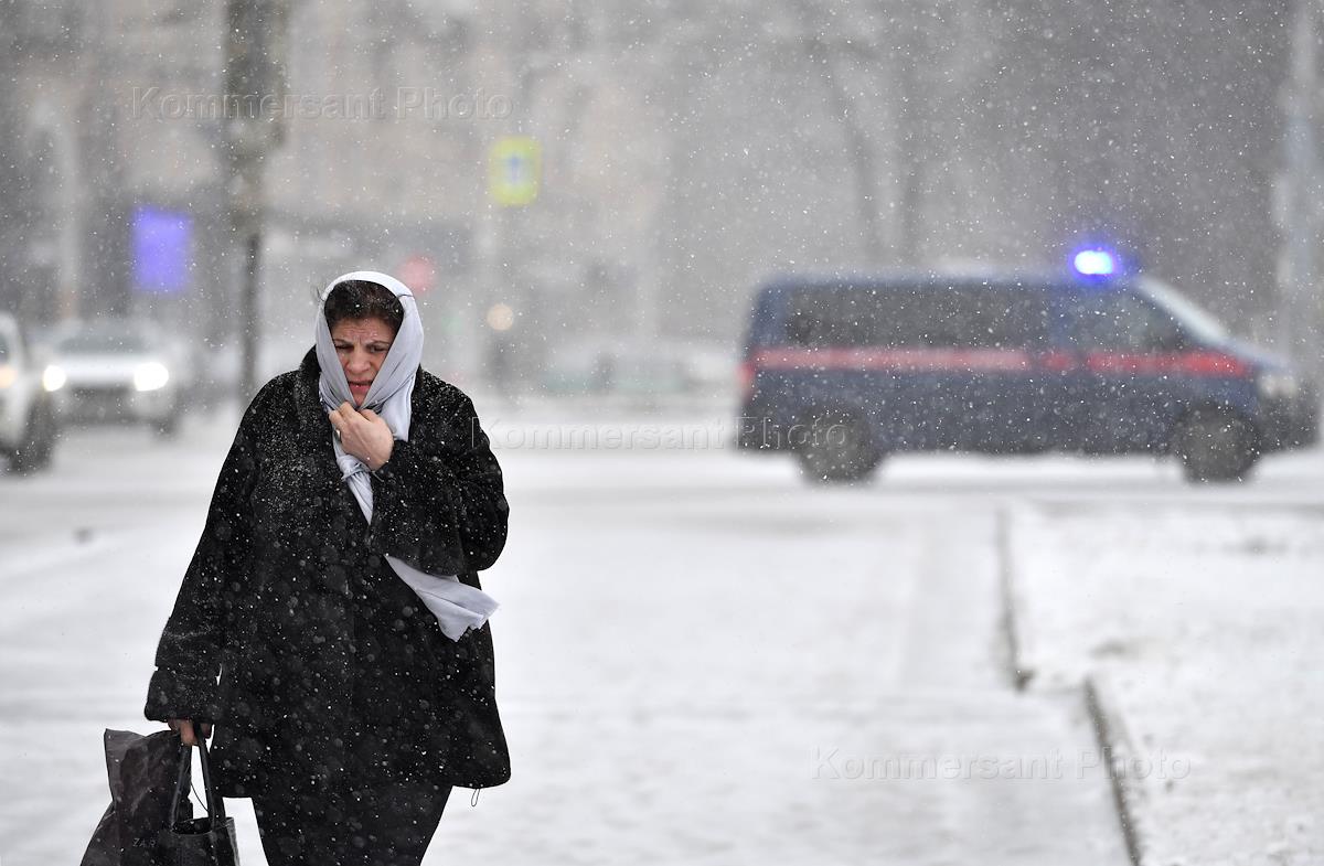 Жанровая фотография. Снегопад в Москве. Женщина идет по улице. Автомобиль Следственного Комитета (СК) России.