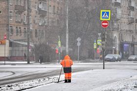 Жанровая фотография. Снегопад в Москве. Сотрудник коммунальной службы города во время уборки снега с тротуара.