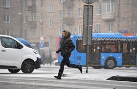 Жанровая фотография. Снегопад в Москве. Мужчина бежит по пешеходному переходу.