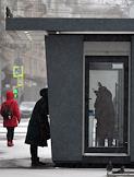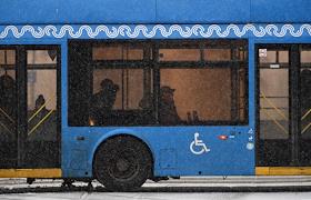 Жанровая фотография. Снегопад в Москве. Городской автобус во время движения. Знак "Инвалид" у входной двери в автобусе.