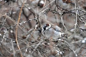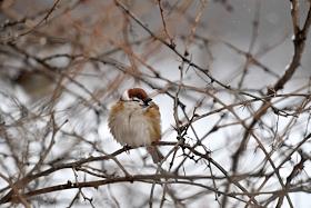 Виды Москвы во время снегопада. Жанровые фотографии. Воробей на ветке.