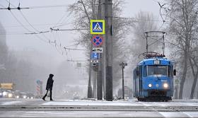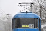 Жанровая фотография. Снегопад в Москве. Трамвай №14 и надпись на электронном табло в салоне "Спасибо".
