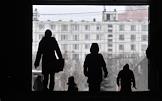 Жанровая фотография. Снегопад в Москве. Силуэты прохожих в арке здания.