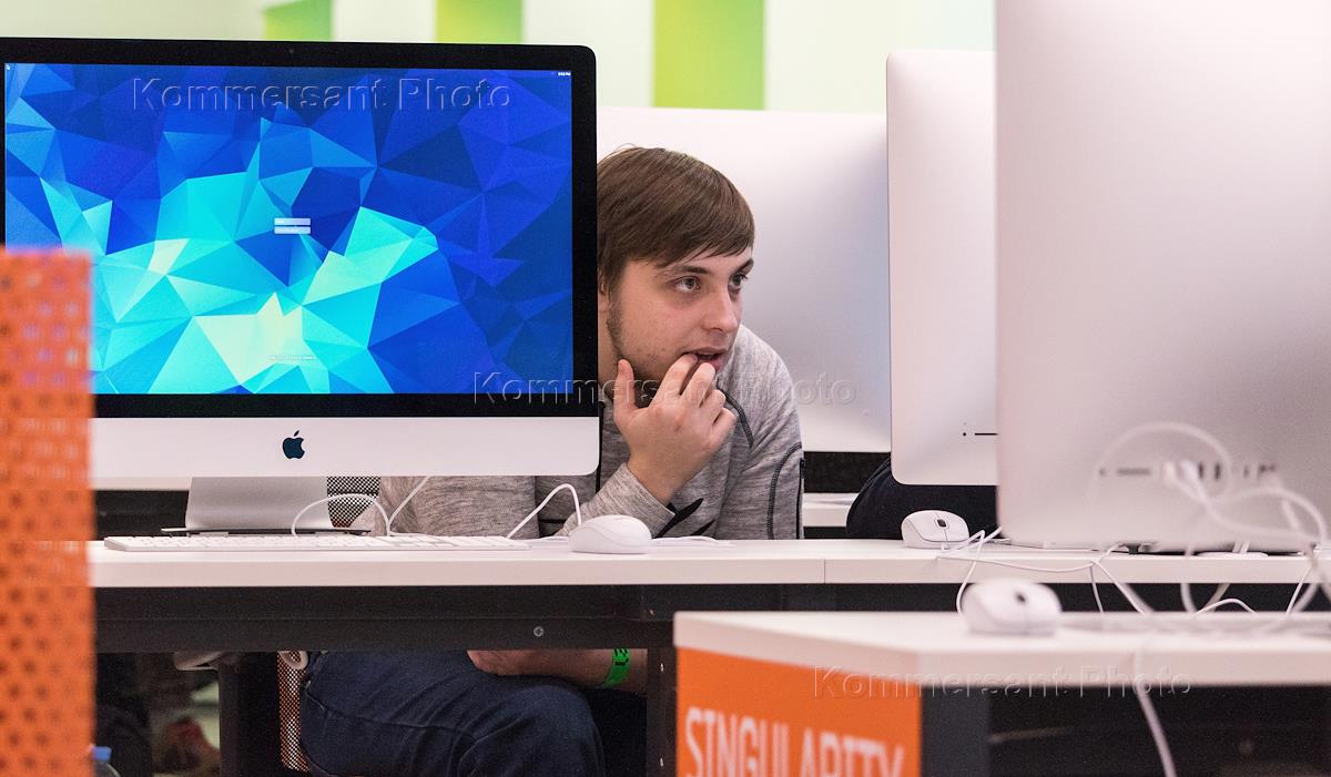 Церемония открытия образовательного проекта ПАО "Сбербанк" "Школа 21" в Казани. Учащиеся цифровой школы. Персональные компьютеры Apple.