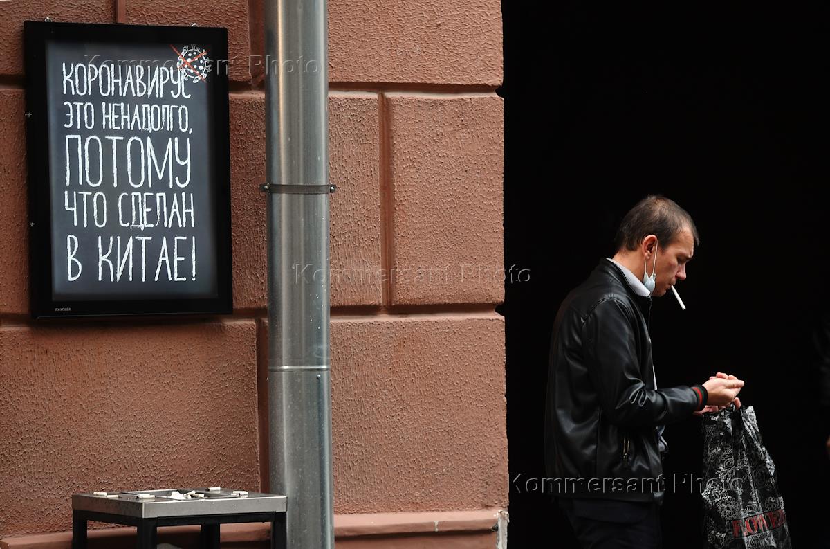 Виды Москвы. Жанровая фотография. Пожилой мужчина в рваной куртке идет вдоль проезжей части.