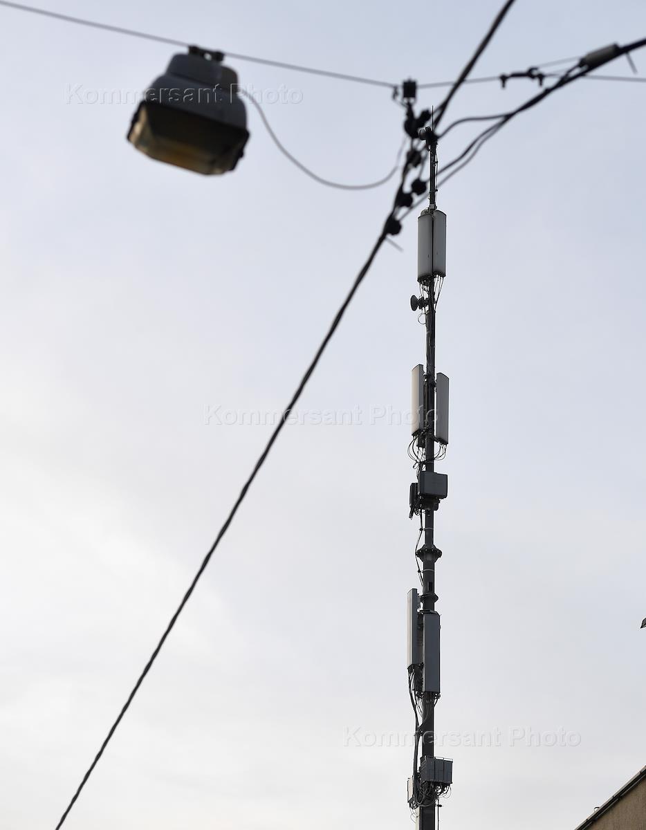 Жанровая фотография. Базовые станции сотовой связи на столбе и на стене здания.