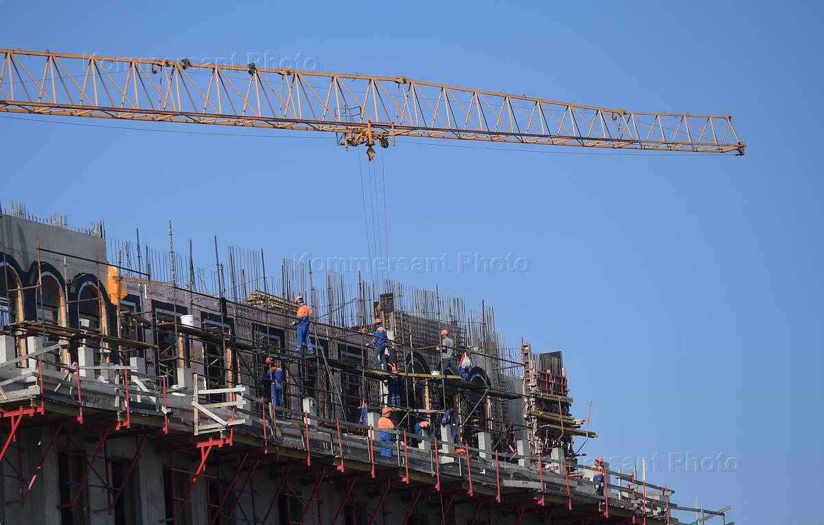 Жанровая фотография. Рабочие во время монтажа арматуры на строительстве здания.