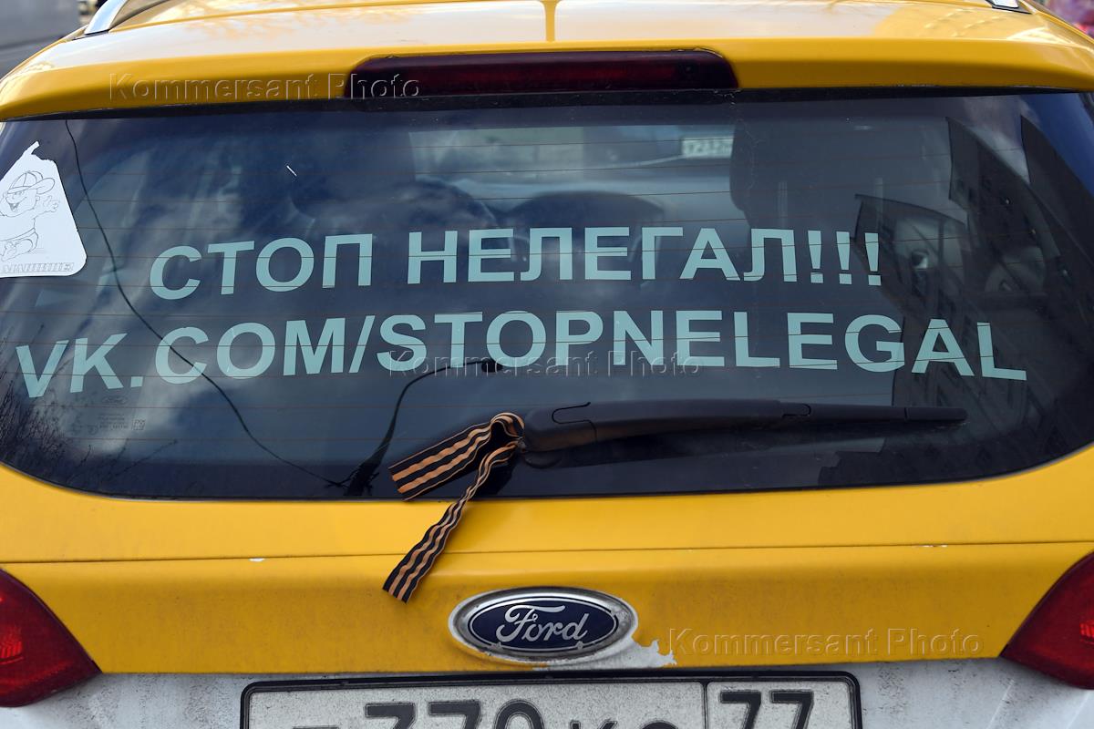Москва во время режима самоизоляции из-за опасности распространения коронавирусной инфекции COVID-19. Жанровая фотография. Надпись на заднем окне автомобиля "стоп нелегал!!!".