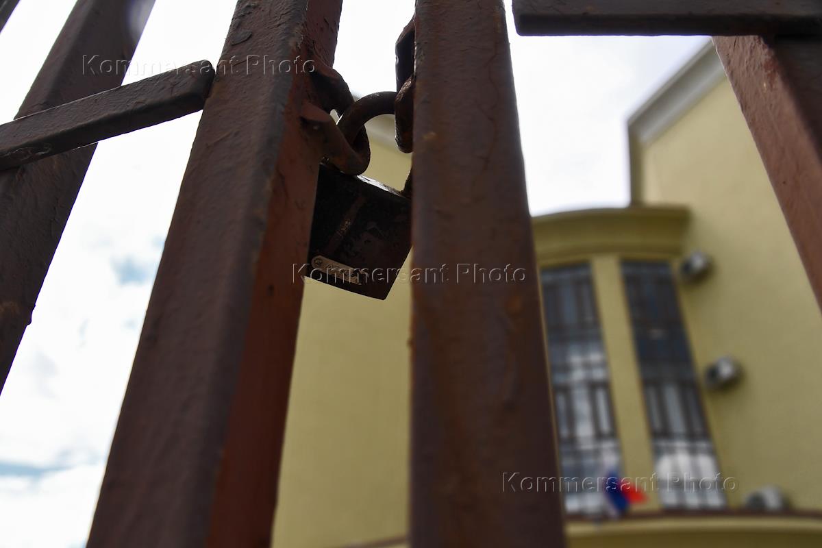 Москва во время режима самоизоляции из-за опасности распространения коронавирусной инфекции COVID-19. Жанровая фотография. Висячий замок на воротах.