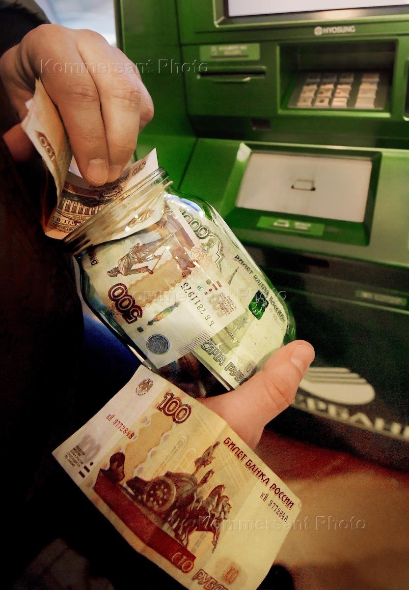 Карантин из-за опасности распространения коронавирусной инфекции COVID-19. Жанровая фотография. Человек с банкой и деньгами у банкомата.