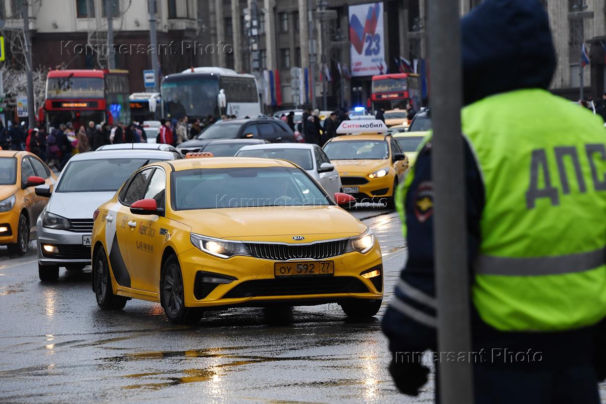 Виды Москвы во время карантина из-за опасности распространения коронавирусной инфекции COVID-19. Жанровая фотография. Световой короб на крыше автомобиля "Яндекс Такси" и Спасская башня Кремля.
