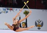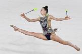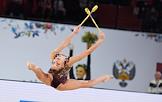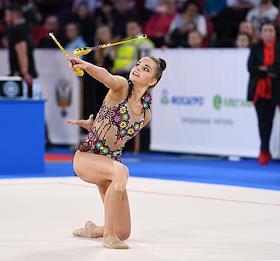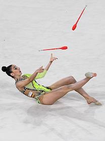 Международный турнир по художественной гимнастике – "Гран-при Москва-2020" во "Дворце гимнастики Ирины Винер-Усмановой" в Лужниках. Испанская гимнастка Наталиа Гарсия во время исполнения упражнения с булавами.