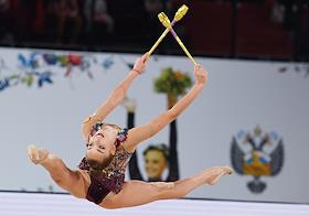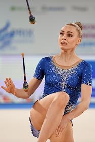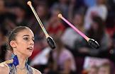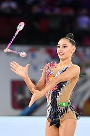Международный турнир по художественной гимнастике – "Гран-при Москва-2020" во "Дворце гимнастики Ирины Винер-Усмановой" в Лужниках. Украинсткая гимнастка Ева Мелещук во время исполнения упражнения с булавами.