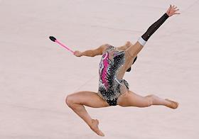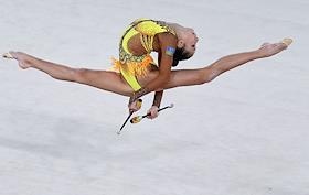 Международный турнир по художественной гимнастике – "Гран-при Москва-2020" во "Дворце гимнастики Ирины Винер-Усмановой" в Лужниках. Хорватская гимнастка Лана Самбол во время исполнения упраждения с булавами.