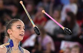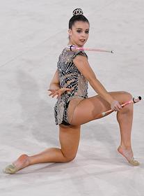 Международный турнир по художественной гимнастике – "Гран-при Москва-2020" во "Дворце гимнастики Ирины Винер-Усмановой" в Лужниках. Греческая гимнастка Елени Келаидити во время исполнения упражнения с булавами.