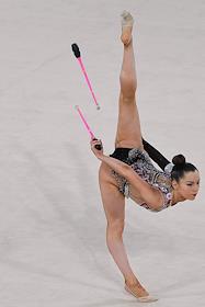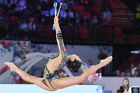 Международный турнир по художественной гимнастике – "Гран-при Москва-2020" во "Дворце гимнастики Ирины Винер-Усмановой" в Лужниках. Испанская гимнастка Рос Эстелер Ноа во время исполнения упраждения с булавами.