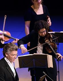 Американский оперный певец Томас Хэмпсон (в центре) во время выступления с камерным оркестром "Амстердам симфониетта" в концертном зале "Зарядье".