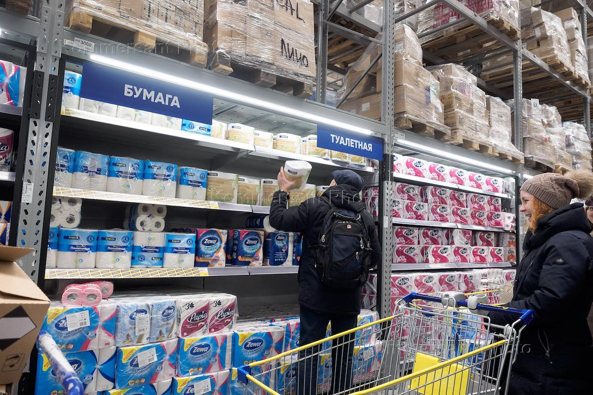 Precautions against coronavirus COVID-19. Genre photo. Customers choose tinned meat in the Lenta hypermarket.